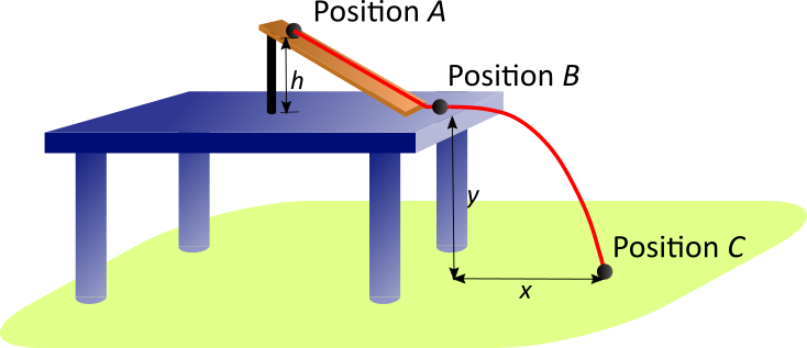 führt danach einen waagerechten Wurf aus und landet auf dem Boden. Es wird die Geschwindigkeit der Kugel auf dem kurzen waagerechten Stück