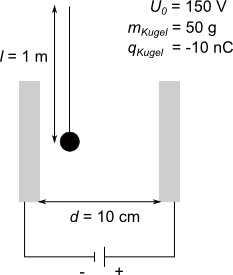 Ein Kügelchen $(m = 50 \text{ g})$ trägt die Ladung $q = -10 \text{ nC}$ und hängt an einem Faden der Länge $l = 1 \text{ m}$. Das Kügelchen